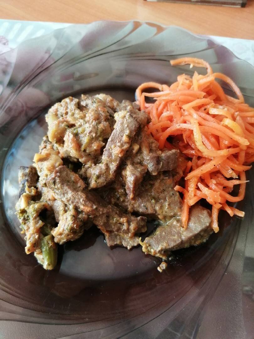 #непп Хорошее сочетание печени и брокколи. Можно подавать с гречкой, макаронами, овощными салатами. Ингредиенты: печень свиная, лук репчатый, морковь, чеснок, брокколи, сметана, соль, перец чёрный молотый, масло растительное, укроп Способ приготовления: Печень промыть, удалить плёнку и прожилки. Нарезать брусочками. Влить в сковороду масло, положить нарезанный лук и немного обжарить. Затем добавить печень, тушить 10 минут под крышкой. Натереть морковь, выложить на печень, закрыть крышкой и тушить ещё 15 минут на медленном огне, помешивая. Добавить мелко нарезанный чеснок, брокколи, соль, перец, немного воды, тушить до готовности. В конце тушения добавить сметану и готовить еще 5 минут. По необходимости посолить. Посыпать укропом.