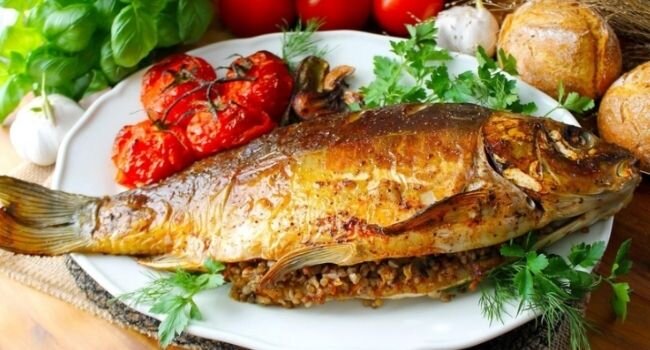Приветствую! Считаю, что каждый рыбак должен уметь приготовить свой улов, знаю, что многие речную, озерную рыбу не едят, но это тоже до того времени, пока не приготовили ее вкусно. Хочу поделиться простым, но очень вкусным рецептом, который понравится всем в семье и вас сами будут отправлять на рыбалку. Сегодня готовим карпа фаршированного гречкой и грибами, получается сразу рыба с гарниром. Готовить будем в духовке, на все про все, примерно, 1,5 часа. По моему мнению идеально для этого подходит свежепойманная рыба, из замороженной немного не то. В нашем случае карпик 1,5 кг весом. Промываем, чистим, потрошим, можно удалить плавники, можно оставить. Далее готовим начинку, нам понадобиться: Не указываю дозировки, потому что делаю "на глаз", но лучше взять побольше, все уйдет в дело, не переживайте. Для начала обжариваем нарезанные шампиньоны, примерно 5-7 минут. Далее добавляем мелко порезанный лук (по вкусу) и натертую на крупной терке морковь. Все вместе обжариваем 4-5минут. Затем от