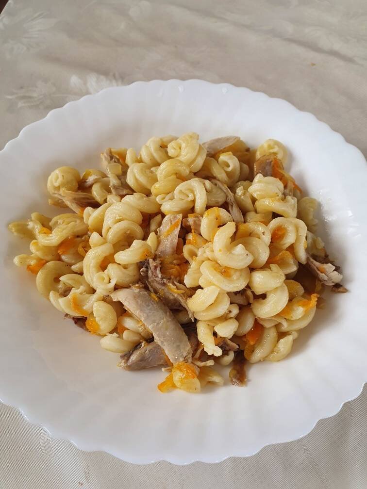 Я его слепила из того что было!)) Приятного аппетита! #непп Ингредиенты: Макароны отварные , Курица отварная , Лук репчатый, Морковка маленькая, Соль , Растительное масло для жарки, Бульон куриный Способ приготовления: Разогреваем сковороду. Наливаем растительное масло. Обжариваем в течение 5 мелко порезанный лук и натертую на крупной терке морковь. Добавляем порванную руками курицу. Обжариваем еще 3 минуты. Вливаем куриный бульон, солим, если нужно. Добавляем макароны, перемешиваем, тушим еще 5 минут. Приятного аппетита!)