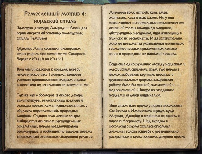 Информация и иллюстрации взяты из клиента игры The Elder Scrolls Online. Навигатор по статьям канала. Ремесленный мотив 4: нордский стиль Заметки доктора Альфидии Люпы для серии очерков об основных культурных стилях Тамриэля (Доктор Люпа состояла имперским этнографом при потентате Савириен - Чораке с 2Э 418 по 2Э 431) Вот мы и подошли к нордам, первой человеческой расе Тамриэля, которая успешно противостоит эльфам и даже вытесняет их гегемонию на континенте. Так же как у босмеров, в основе декора архитектуры, ремесленных изделий и одежды нордов лежат стилизованные, с обилием переплетений, природные мотивы. Однако если лесные эльфы выбирают в основном растительные орнаменты, норды предпочитают зооморфные, в особенности выделяя восемь "тотемных" животных старинной религии Атморы: волк, ястреб, кит, змея, мотылек, лиса и так далее. Но у них позволяются значительные отклонения от основной темы вплоть до мотивов, абстрактных настолько, что животных в них уже не распознать. И действительно,