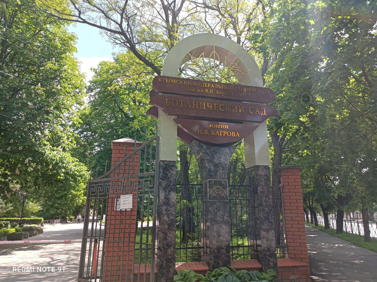 Ботанический сад КФУ имени Багрова находится на проспекте Вернадского, напротив гостиницы "Москва". Он занимает площадь до главного корпуса КФУ. Так выглядит главный вход.