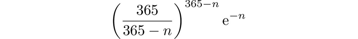 В сумме это число вариантов, что совпадений не больше одного. Поделим на 365ⁿ, получив вероятность, что совпадений не больше одного. Вычтем из единицы, получив вероятность хотя бы двух.