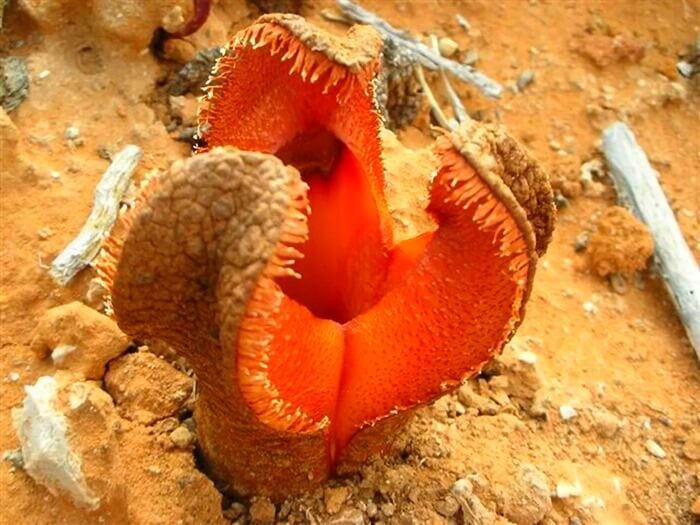 Этот чудовищно выглядящий цветок родом из Южной Африки. Запах его под стать внешнему виду. Однако, несмотря на свои недостатки, гиднора африканская имеет чрезвычайно вкусные ягоды. Они не только вкусные, но и полезные, местные жители лечат ими заболевания сердечно-сосудистой системы.
