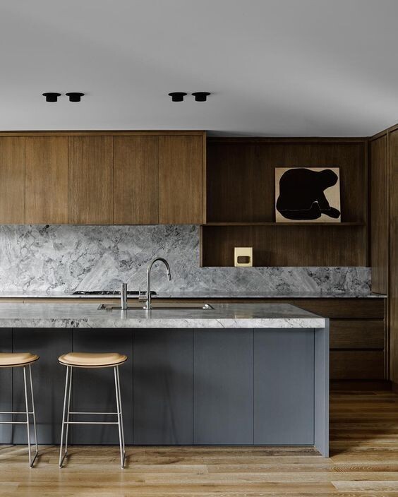 Фартук Данный элемент влияет на внешний вид всей кухни. Красивый гарнитур легко испортить дешевым и некрасивым фартуком. Решение: керамическая плитка станет стильным решением проблемы, панели под дерево в одной цветовой гамме со столешницей, широкоформатный керамогранит под мрамор. Декор Декор должен соответствовать цветовой гамме комнаты. Решение : если тяжело подобрать такие же оттенки, используем зеленые растения и кашпо. Цвет шкафчиков Пастельные и спокойные оттенки никогда не потеряют своей актуальности. Стиль Актуальные стили интерьера на данный момент: неоклассика и скандинавский. Современный стиль - это минимализм и натуральные материалы. Скандинавский - это белые и серые оттенки в сочетании с натуральным деревом и креативными элементами декора. Фактура дерева Сейчас популярны прямые фасады под дерево. Теплый свет На кухне уютнее смотрится теплый подсветки.