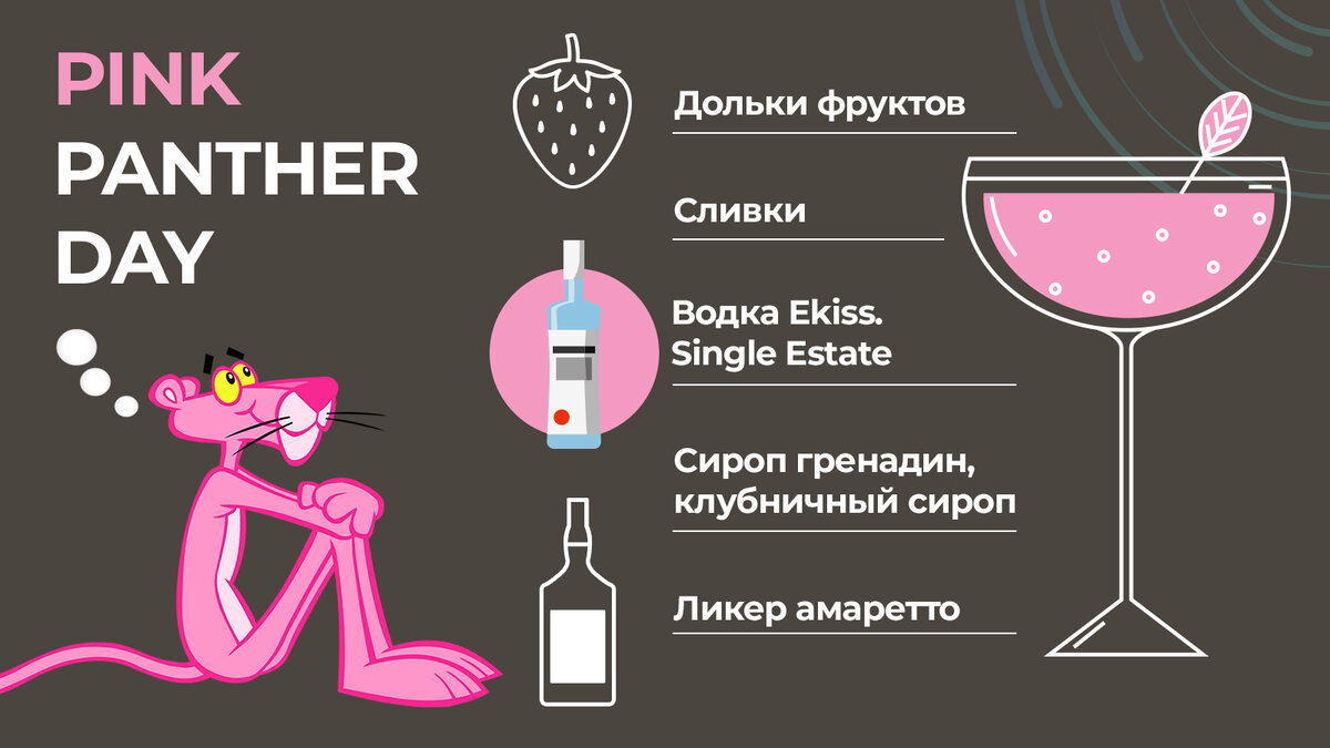 Ежегодно 18 мая отмечается необычная дата – День Розовой Пантеры. День посвящен известному персонажу художественных и мультипликационных фильмов – Розовой Пантере. Основой праздника провозглашена способность данного персонажа к нестандартному мышлению, способности к созиданию, творчеству и позитивному настрою. Поклонников Розовой Пантеры множество в самых разных профессиях. Благодаря одному из них - бармену – на свет появился эффектый и вкусный коктейль Розовая Пантера нежного розового цвета и со сливками. За короткий срок напиток стал столь популярен, что появилось множество вариаций на тему. Мы предлагаем повторить оригинальный рецепт, для ценителей классики: Ингредиенты: Приготовление: Все максимально просто! В качестве основы для этого коктейля предлагаем французскую водку премиум-класса Ekiss. Рожденная на юге Франции, в дельте реки Роны в волшебном Камарге из экологически-чистой пшеницы, сертифицированной по европейским стандартам ECOCERT, водка Ekiss отличается мягкость