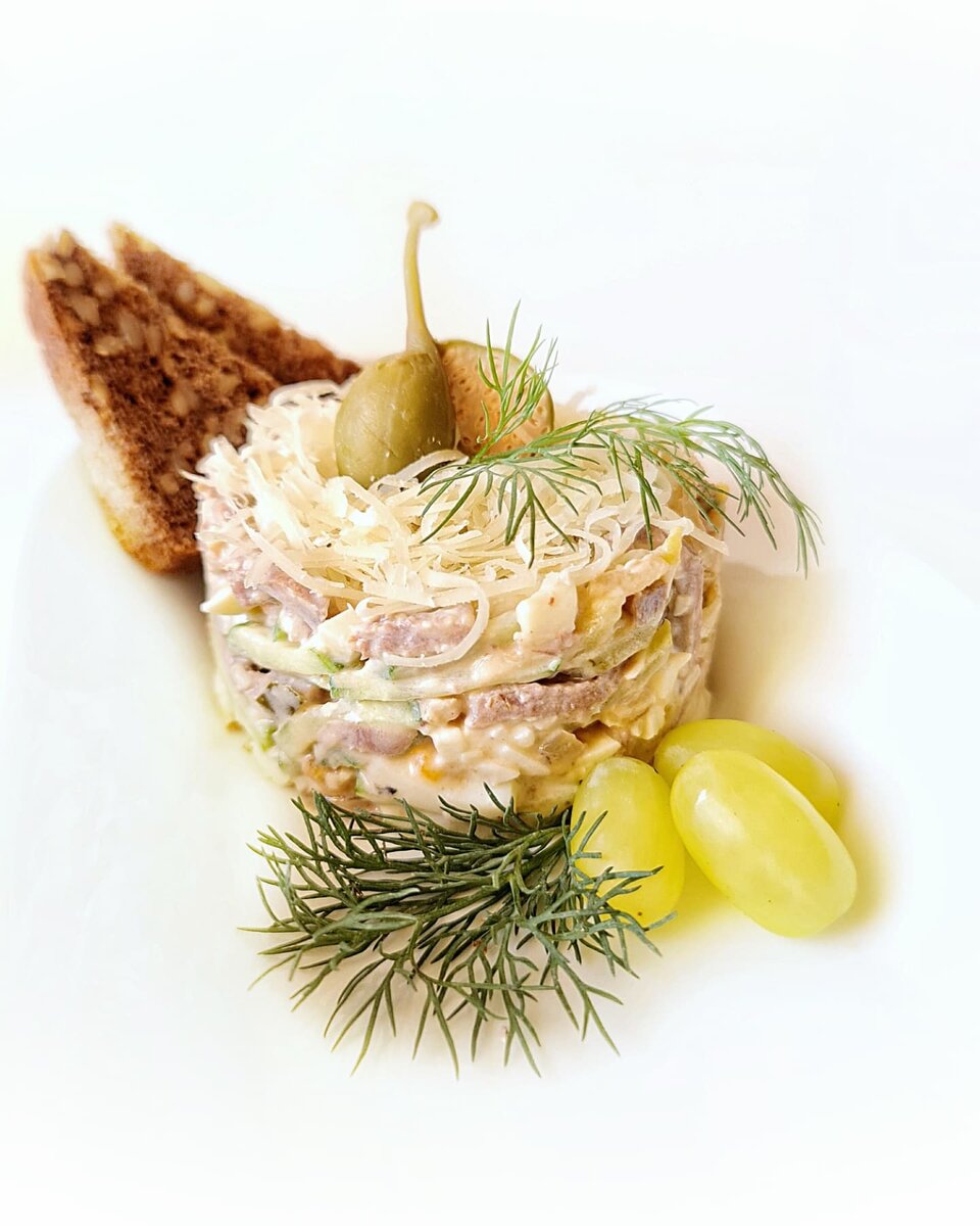 Приготовив этот замечательный салат впервые, я назвала его "Волшебный". Почему волшебный? Все очень просто: -ингредиенты для этого салата найдутся практически в любом холодильнике. -если какого-то продукта вдруг не оказалось, его очень легко заменить. -салат получается достаточно сытный и одновременно не тяжёлый. Попробуем приготовить! Нам потребуется: -любое отваренное мясо: говядина, курица или как в моем случае, телячий язык. -шампиньоны. -репчатый лук. -свежий огурец. -яйца. -сыр. -грецкие орехи (можно взять кедровые или обжаренные тыквенные семечки). -солёный огурец (в их отсутствии, я использую яблоко). -греческий йогурт для заправки (варианты замены: обычный йогурт или сметана). -соль, перец по вкусу. Дальше, все очень просто. Мясо нарезаем тонкими брусочками. Обжариваем в небольшом количестве растительного масла лук, нарезанный полукольцами и шампиньоны, пластинками. Режем огурцы и яйца соломкой. Орехи измельчаем ножом. Сыр натираем на мелкой тёрке. Соединяем все в миске, соли