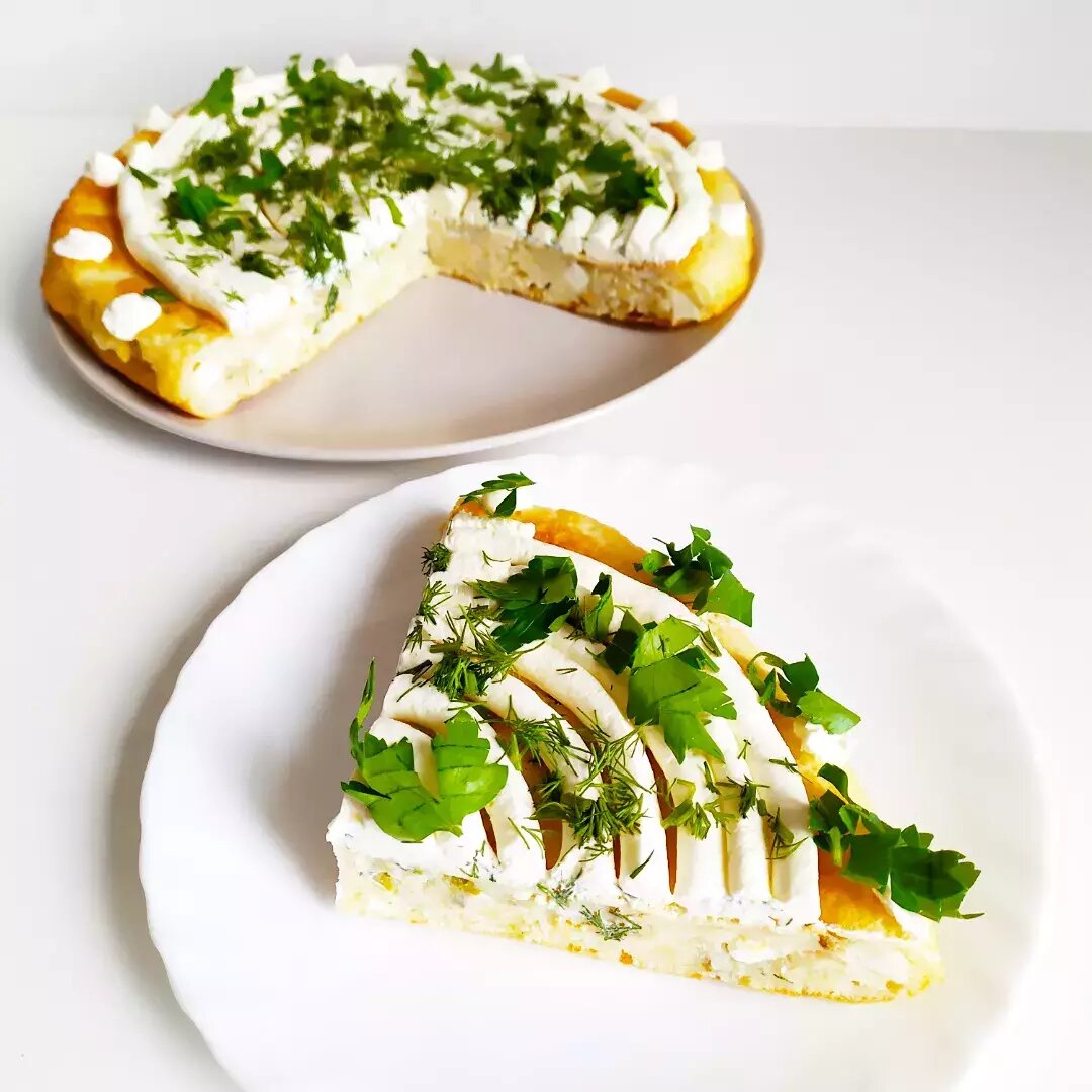 Ингредиенты: сырое яйцо, кефира, пшеничной муки в/с, соды, соли, рыбных консервов (горбуша, сайра или другая рыба), варëных яйца, твёрдого сыра, укропа (петрушки, зелёного лука), сливок 33%, творожного сыра Способ приготовления: Яйцо комнатной температуры с солью перемешать венчиком до однородности, добавить кефир комнатной температуры и перемешать до однородности, всыпать просеянную муку с содой и перемешать до однородности. Если тесто вязкое, добавить немного кефира. Рыбные консервы размять вилкой, вареные яйца мелко нарезать, сыр натереть на крупную тëрку, зелень мелко нарезать, всё хорошо перемешать. Форму для выпечки смазать подсолнечным маслом, налить половину теста, выложить на него начинку ровным слоем и вылить сверху оставшееся тесто. Выпекать в разогретой до 180 С духовке 40-50 минут, ориентируясь на свою духовку, когда сверху зарумянится корочка, значит пирог готов. Взбить сливки с творожным сыром до густой однородной массы и украсить пирог кремом и зеленью по вкусу.