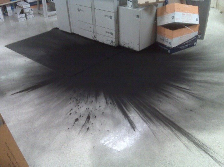 Тонер состоит из очень мелких частиц пластика, он легко рассеивается в воздухе и сильно подвержен влиянию статического электричества. Поэтому, для уборки нельзя пользоваться обычным пылесосом. Скажем так: если вы думали, что у вас грязно и решили пропылесосить тонер обычным пылесосом