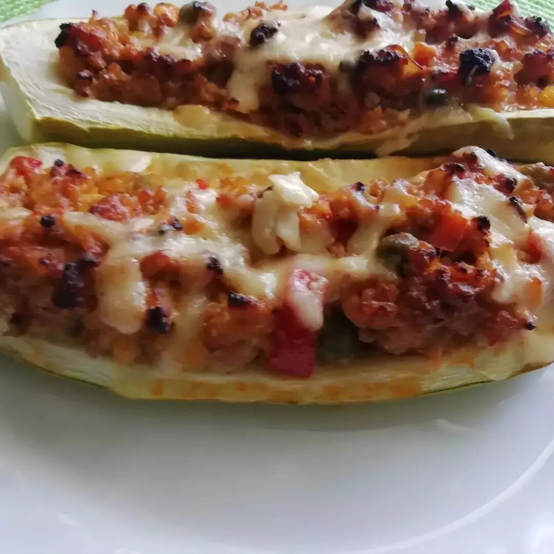 #непп #кабачкифаршированные #кабачки Ингредиенты: маленьких кабачка, - фарша, - помидор, - Лук репка, чеснока, - болгарский перец, Острый Чили по желанию, Сыр твердый/плавленый, Я добавила горсть гавайской смеси Способ приготовления: Кабачки разрезать вдоль, аккуратно вынуть мякоть. Нарезать её кубиком. Лук нарезать кубком, обжарить до прозрачности с добавлением растительного масла, добавить измельченный чеснок. Затем добавить кабачки, фарш, разбить комочки. Обжарить 5-7 мин. на среднем огне. Добавить перец соломкой, обжарить 5 мин, теперь добавляем помидор кубиком. Солим, перчим по вкусу. Снимаем с огня добавляем горсть на тёртого сыра. Перемешать. Половинки кабачка присолить заполнить фаршем. Ставим на противень, наливаем стакан воды. Запекать при 180 С 40-50 мин. Посыпать сыром. Оставить в духовке на 5-7 мин. Подаем со сметаной. Приятного аппетита!!!