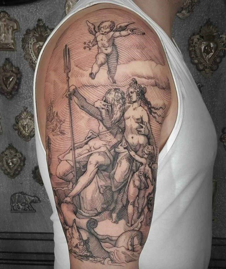 ИСТОРИЯ ГРАВЮРЫ Гравюра - это форма переноса рисунка на твердый материал типа дерева, железа и другие. Для классической гравюры характерны: черный цвет, четкость линий, контуры и передача любого объема штриховкой. Это искусство появилось в 6 веке нашей эры и в это время изображения были очень примитивными. С развитием культуры и механических инструментов сюжеты и формы гравюр начали постепенно усложняться. Современная гравюра - это чрезвычайно сложный вид искусства, требующий высочайшего мастерства художника. ГРАВЮРА В ТАТУИРОВКЕ В татуировке практически то же самое. Гравюрные тату выполняются исключительно черным цветом, без плотного закраса, объем также, как и в графике передается с помощью штриховки. Сам стиль гравюра в татуировке по своей сути является лишь подвидом График, а выделяющая его основа лежит в сюжетной составляющей работ. Гравюра в тату - это очень привлекательные, манящие своей простотой и лаконичностью татуировки. Гравюрные татуировки отлично сочетаются с любыми моно