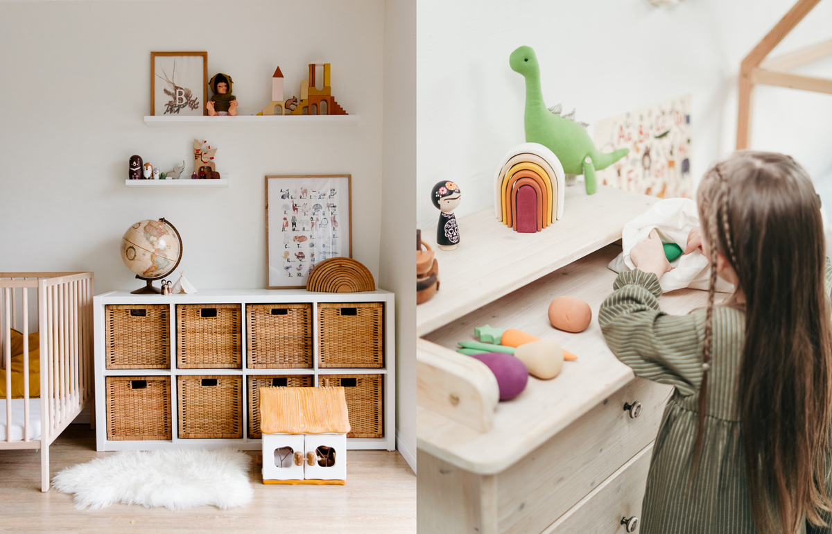 Для того, чтобы комната выглядела всегда аккуратно, нужно правильно организовать игровое пространство ребенка. Это можно сделать с помощью системы хранения, удобной прежде всего для самого ребенка. Красивое хранение. В чем хранить игрушки? Самый простой — закрытое хранение, комод или шкаф. Открытое хранение — стеллаж или подвесные полки. Коробки, сундучки, корзины или карманы на стене. И самый практичный — контейнеры. Подберите красивые корзины для хранения. Все яркие, пластиковые игрушки, складываем в корзины, но не до самого верха, чтобы не торчали, и последний штрих — посадить сверху корзины красивые игрушки в цветовой гамме комнаты. Конструкторы и цветные пластиковые игрушки лучше хранить в закрытых коробках или непрозрачных контейнерах. Если контейнеры прозрачные, лучше убирать их в шкаф, чтобы не создавать визуальный шум. Мелкие игрушки, например киндеры, сортируем в маленькие коробочки или контейнеры с крышкой, и складываем в большие непрозрачные контейнеры или выдвижные ящики