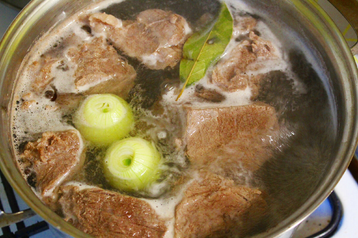 соль Мясо (лучше на кости) залить холодной водой и поставить на огонь. Как закипит, тщательно снять пену и сразу закинуть лук, чеснок и специи с солью. Варить на слабом огне минут 40 - 50. (возможно это неправильно, но я, минут за 15 д