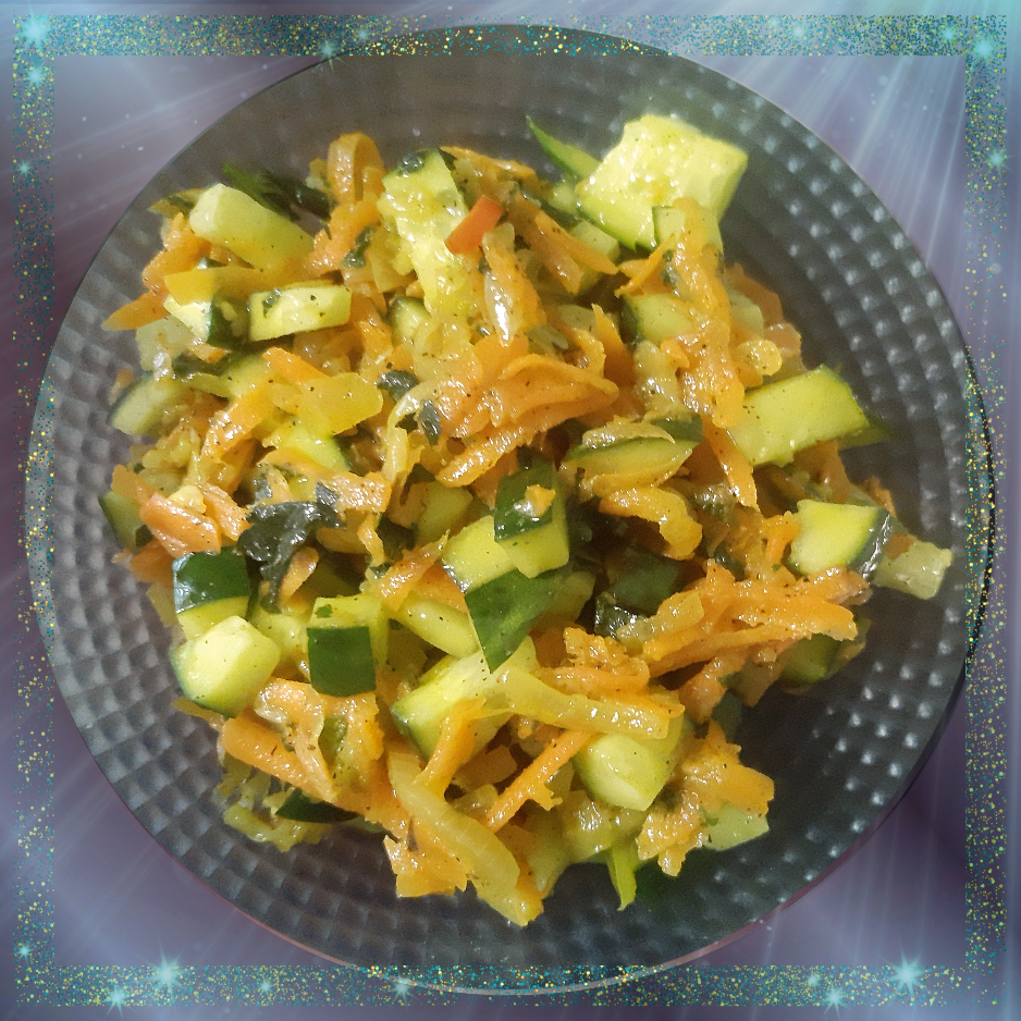 Ингредиенты: Морковь 🥕, сельдерея, Репчатый лук, Огурец, Оливковое масло, Соль и чёрный молотый перец, крапивы Способ приготовления: Морковь очистить и натереть на крупной тёрке. Репчатый лук нашинковать и стебли сельдерея нарезать на кусочки. Всё соединить, посолить, поперчить и заправить оливковым маслом. Оставить на несколько часов. На сковороде в овощи налить немного воды и поставить на огонь тушить. Крапиву залить горячей водой на 1 минуту, воду слить, крапиву нарезать и добавить в сковороду. Тушить в пределах 5 минут. Огурец нарезать кубиками и добавить к нему готовые овощи, можно в горячем или в тёплом состоянии. Перемешать. Вкусно получается.