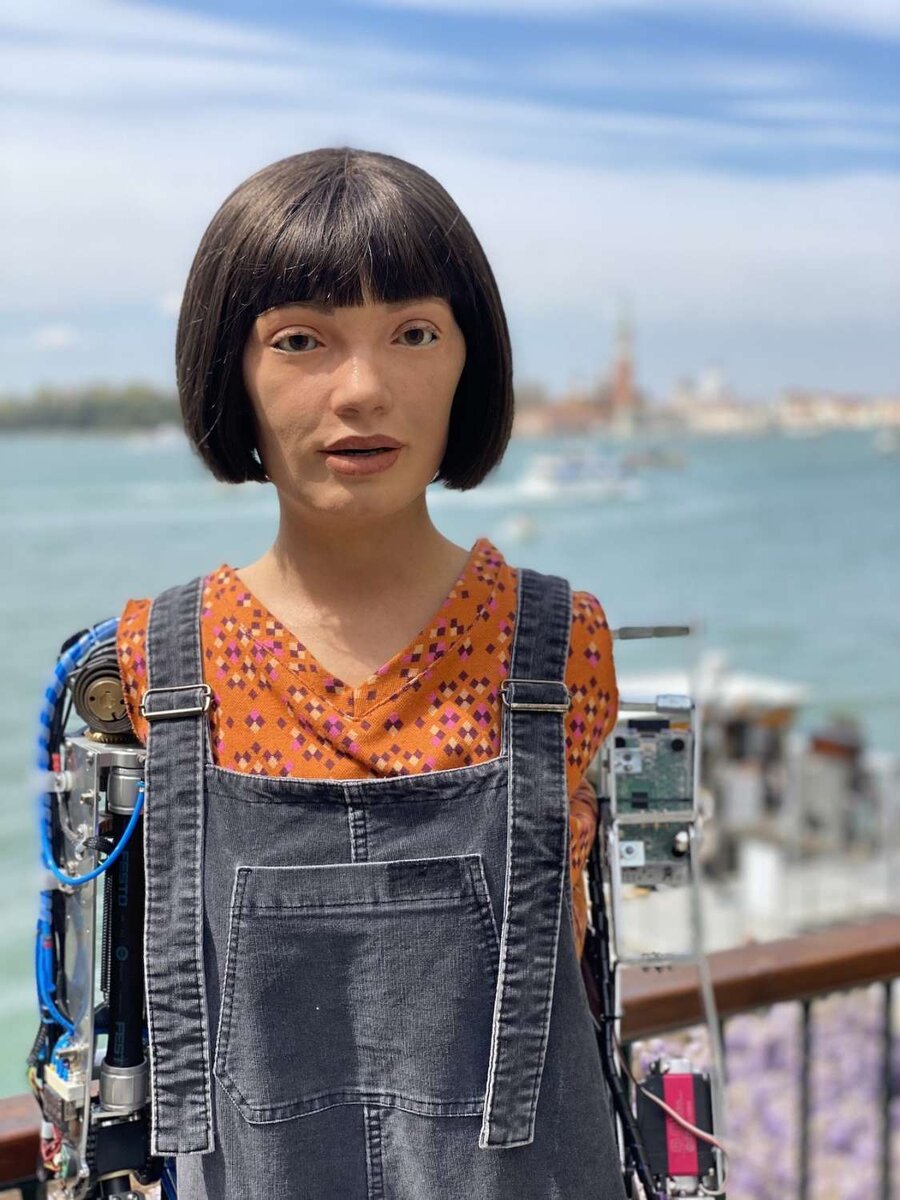 Традиционно на Венецианской биеннале проходят выставки художников, но в 2022 году персональную выставку получила Ai-Da – первый в мире человекоподобный робот-художница. Сначала Ai-Da создавала карандашные рисунки, а со временем «научилась» писать красками Ai-Da появилась в 2019 году в британском Оксфорде. Над ней работала команда программистов, роботехников, искусствоведов и психологов, возглавляемая Эйданом Меллером. В том же году ее презентовали и с тех пор Ai-Da постоянно обновляют по мере совершенствования технологий искусственного интеллекта. Изначально Ai-Da создавала карандашные портреты, изображения животных и натюрморты, основывая их на снимках. Со временем она научилась создавать картины красками с натуры, используя свое «зрение» – встроенные камеры. Глаза Ai-Da фиксируются на объекте, алгоритмы обрабатывают его, принимают решения – и в итоге создают картину. «Хотим ли мы, чтобы роботы создавали искусство?» Меллер относится к Ai-Da как к «этическому проекту», в его задачах не
