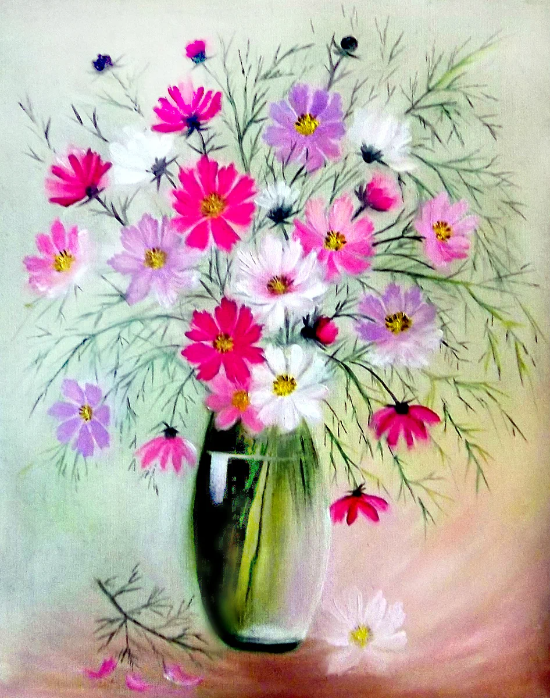 Дивные цветы космеи - мои самые любимые цветы . Опишу их красоту стихами неизвестного мне автора .. Цветок космеи - нежный космос безумной летней красоты !.. Цветы космеи словно звезды , огнем рассыпались в ночи .. Цветок космеи прост в созвучии среди иных цветов земли , Но есть в нем сердцу любованье и благодарный свет души . Не раз пыталась написать маслом эти чудные цветы , но передать их красоту самостоятельно не удавалось, пока не увидела видео мастер- класс на эту тему . И вот , что в итоге получилось . В этой подборке фотографий покажу этапы написания картины . Это может пригодится для совсем начинающих художников и кому это интересно .. Использовала краски : краплак розовый прочный , белила титановые , зелень травяная , желтая лимонная , ультрамарин светлый ...