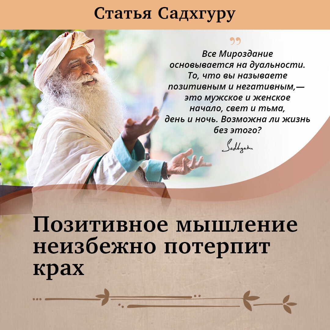 Садхгуру: Слишком много людей в мире постоянно говорят о «позитивном мышлении». Когда вы рассуждаете о позитивном мышлении, в каком-то смысле вы пытаетесь уйти от реальности. Вы хотите смотреть только на одну сторону жизни, упуская из виду другую. Конечно, вы можете игнорировать ее, но она не будет игнорировать вас. Если вы не будете принимать во внимание негативные аспекты этого мира, то будете жить в раю для дураков. Жизнь проучит вас за это. Предположим, что сейчас в небе сгустились черные тучи. Вы можете игнорировать их, но они не будут игнорировать вас. Когда идет дождь — идет дождь. Если вы промокли — значит, вы промокли.