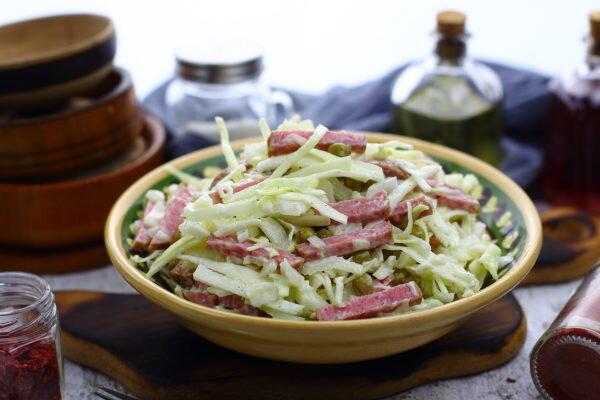 ИНГРЕДИЕНТЫ 1 шаг Капусту мелко нашинковать. Колбасу нарезать полосками. 2 шаг Капусту присолить (0,3 ч.л. соли на 300 г капусты). Помять без усердия, чтоб капуста немного пустила сок, примялась. В целях гигиены на руку можно одеть одноразовую перчатку или пакет. 3 шаг Соединить капусту, колбасу и горошек. Добавить майонез. Перемешать. Приятного аппетита! #салаты рецепты #салаты и закуски #салат на праздничный стол