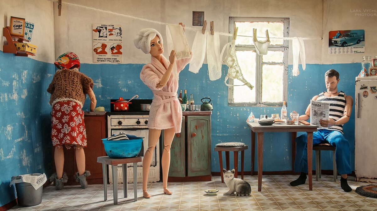 Для большинства из нас СССР - это единственное место, которое мы никогда не увидим. Барби, однако, отправляется в прошлое, чтобы увидеть, каково это было - жить в нем. Екатеринбургская художница-визуалист Лера Вычужанина воссоздала реалистичную миниатюрную диораму советской квартиры и сфотографировала Барби, пока она там жила. Вычужанина также сделала несколько фотографий Кена, которого Барби взяла с собой в поездку. Благодаря кропотливым усилиям Вычужаниной Барби и Кен оказались в старой советской коммунальной квартире, действие которой, судя по всему, происходит где-то в 1980-х годах. Несмотря на то, что она достаточно молода, чтобы не иметь должных воспоминаний о СССР, Вычужанине удается передать настроение и атмосферу, которые восхитительно китчевы и ностальгичны. Любовь кроется в деталях. Заботясь больше о чувстве и тоне обстановки, чем об исторической точности, Вычужанина приложила много усилий, чтобы превратить коробку размером 60 х 40 х 50 см (23,6 х 15,7 х 19,6 дюйма) в мини-с