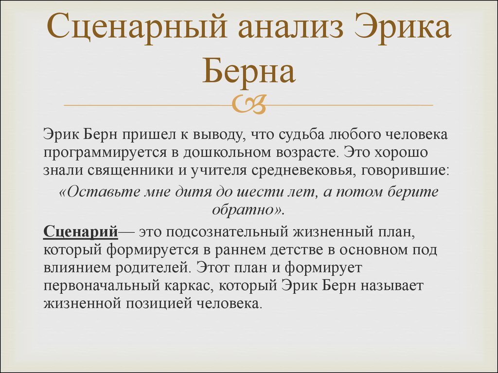 Увлекаясь книгами американского психолога Эрика Берна, я узнала для себя много интересного. Особенно меня впечатлила его теория 12 родительских приказаний или установок (директив). Фразы, которые ребёнок слышит в детстве, отпечатываются у него в сознании и влияют даже тогда, когда он вырос. Многие мои вопросы получили ответы, потому что так или иначе все проблемы идут из детства. Теория Эрика Берна будет полезна каждому родителю, так как путём осознания мы можем воспитать здоровых и счастливых детей.