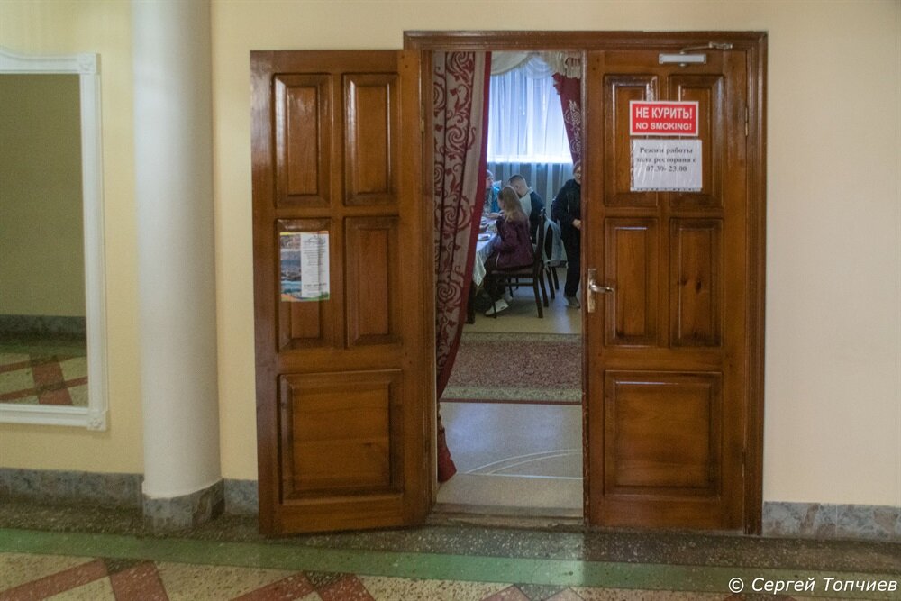 Забираю все свои основные пожитки путешественника. Фотоаппарат, аккумуляторы направляюсь в столовую для завтрака. В зале на столах разложены приборы и ждут нас. Кипяток нагрет для любителей чая или кофе. Стулья ждут своих посетителей.