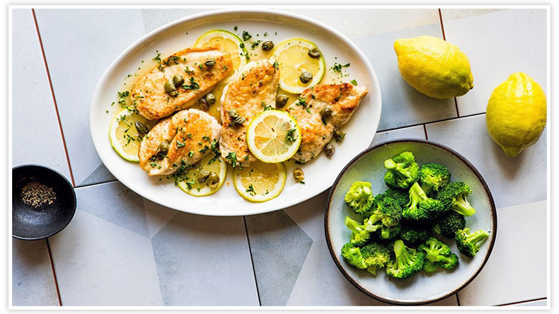 Куриная грудка без костей и кожи, брокколи и лимон — три полезных продукта, которые могут быть частью диеты для похудения.