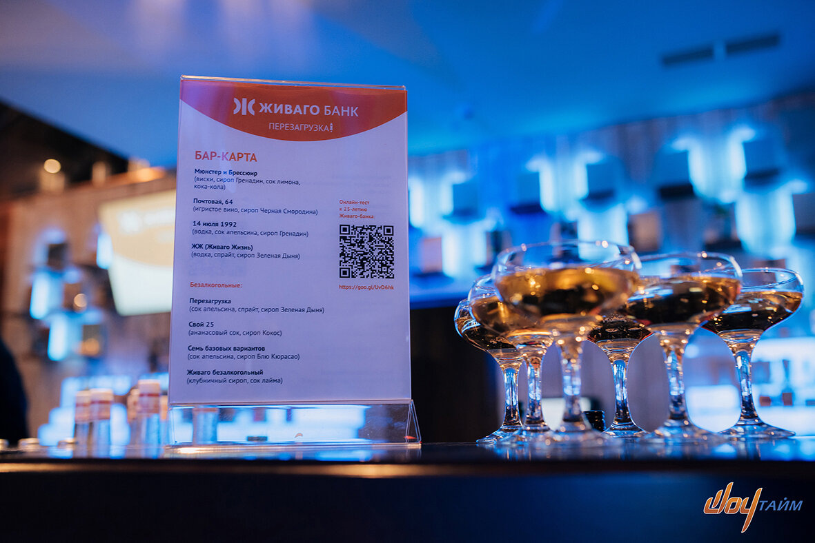 Для 25-летия рязанского Банка Живаго мы в свое время придумали прикольную коктейльную карту, например, и онлайн-тест про банк. Первые покорители теста были приглашены на сцену и награждены сразу после прохождения его на своих смартфонах по ходу события. Что логично, ведь правильные ответы на вопросы теста мы спрятали в названиях этих коктейлей...