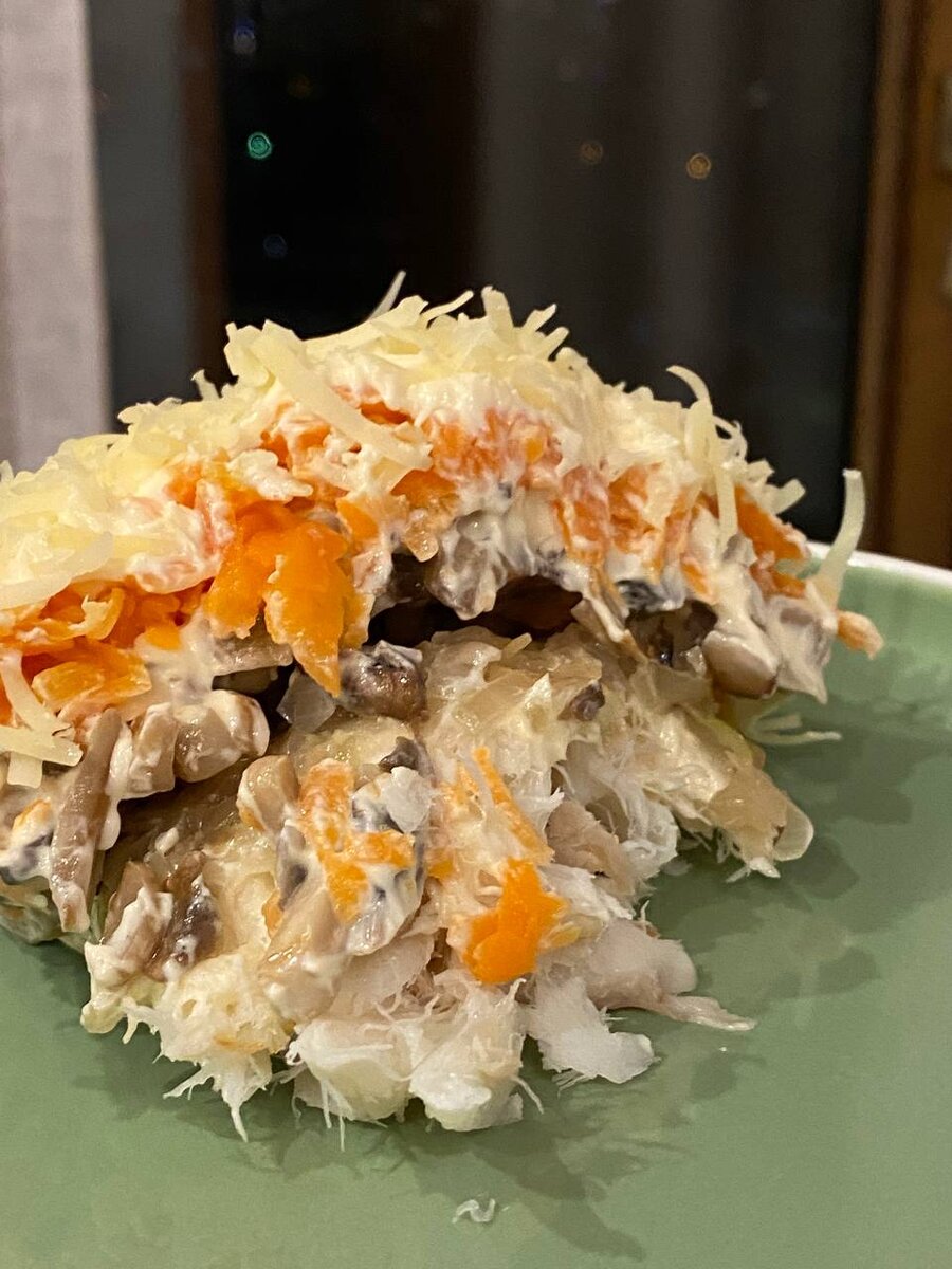 🔸400гр рыбы горячего копчения ( зубатки, сёмги, форели ) 🔸400гр шампиньонов 🔸1 крупная луковица ( можно заменить соответствующим количеством лука шалот) 🔸3 средние морковки 🔸майонез 🔸сыр типа сметанкового 50-70г Время приготовления: 30-35мин. 👩🏼🍳 1️⃣Рыбу разобрать на мелкие кусочки. 2️⃣Грибы мелко порезать и поджарить, почти без масла. 3️⃣Лук мелко пошинковать и пожарить ( добавив сахара как соли) 4️⃣Морковь очистить и отварить альденте.На дно салатника выложить рыбу. 5️⃣Дальше: лук грибы морковь, натёртую на крупной тёрке 6️⃣Каждый слой промазывать майонезом. 7️⃣Сверху посыпать тёртым сыром. 🔴 Если под рукой только минтай отварить его, а дальше по рецепту. Только майонеза на рыбку чуть больше.