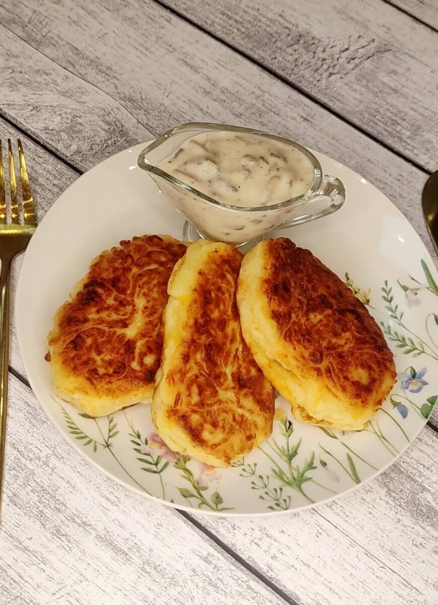 Котлеты из картофеля с сыром, сытное и очень вкусное блюдо, особенно вкусно с грибным соусом Ингредиенты: Картофель , Мука + для обваливания, Яйцо куриное, Соль , Перец черный молотый , Сыр твердый Способ приготовления: Картофель отварить до готовности, слить воду и дать остыть. Размять как для пюре. Сыр натереть на тёрке и добавить к картошке. Посолить и поперчить по вкусу. Добавить яйца и муку постепенно перемешивая, нужно получить плотную консистенцию, чтобы можно было слепить котлетки. Все хорошо вымешиваем. Мокрыми руками формируем котлеты и обваливаем в муке. На хорошо разогретой сковороде на среднем огне обжарить с двух сторон до золотистой корочки. Подаём с любым соусом по вкусу, но вкуснее всего с грибным 👍