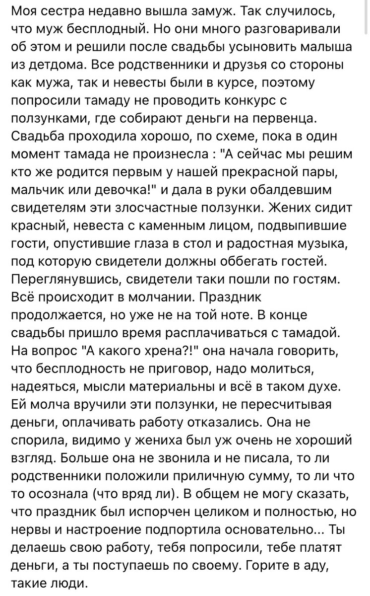 - Пожелание гореть в аду из-за такой мелочи тоже порадовало. В конце концов, молодые и сами виноваты. С тамадой, видимо, толком и не проговаривалось ничего. Либо у нее умственная отсталость, а они и не заметили. Что ж, будут впредь внимательнее;)