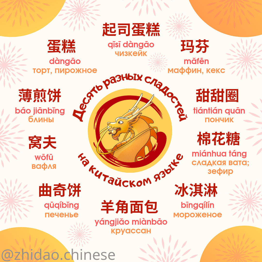 #zhidao_способы_сказать Сегодня предлагаем вам поговорить о сладостях на китайском языке: представляем вашему вниманию десять видов! 🍭 1️⃣ 起司蛋糕 qǐsī dàngāo - чизкейк 2️⃣ 玛芬 mǎfēn - маффин, кекс 3️⃣ 甜甜圈 tiántián quān - пончик 4️⃣ 棉花糖 miánhua táng - сахарная вата; зефир, маршмэллоу 5️⃣ 冰淇淋 bīngqílín - мороженое 6️⃣ 羊角面包 yángjiǎo miànbāo - круассан 7️⃣ 曲奇饼 qūqíbǐng - печенье (от английского "cookie") 8️⃣ 窝夫 wōfū - вафля (от английского "waffle") 9️⃣ 薄煎饼 báo jiānbǐng - блины, панкейки 🔟 蛋糕 dàngāo - торт, пирожное 📝 Ссылка на карточки Quizlet для изучения новых слов: https://quizlet.com/_bl6jh5?x=1qqt&i=2r5snr ❗В Quizlet вы можете послушать произношение всех слов! Для этого нажмите на значок микрофона 🔊 📚 Хотите, чтобы Вы или Ваш ребенок заговорили на китайском? Напишите нам для записи на групповые / индивидуальные занятия! 🎓 #china #chinese #школакитайского #китайский #москва #язык #китайскиймосква #учукитайский