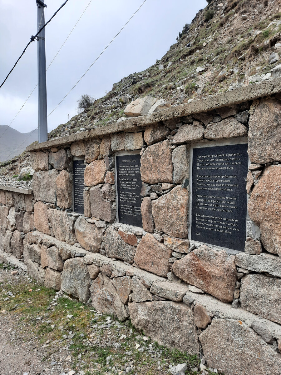 Я обещала Вам рассказать о памятнике "Книга в камне" и о доме , где родился Кулиев. Всё это находится в селении Эл-Тюбю в Чегемском ущелье. А мы там оказались во время экскурсии на джипе. Как видите на фото, памятник это стена из камня, в которой сделаны вставки со стихами поэта. Стена эта длинная. И тянется она вдоль дороги, ведущей туда, где находится Дом, в котором родился Кулиев. Я шла и читала стихи. Есть те, что очень хорошо знаю. А есть, которые не помнила, но их строки отзывались в сердце и вспоминались. Как же верно звучит:" Легко любить всё человечество, соседа полюбить сумей." Возникло острое желание почитать о Кулиеве и стихи его почитать. Это имя мне хорошо знакомо. Не так много в советское время звучало имён поэтов из разных республик. И они в память врезались . Расул Гамзатов, Окуджава, Кулиев. Да и стихи их тоже в памяти есть. Особенно те, которые песнями стали. А вот их биографии для меня белые пятна. Задумалась я там над этим. Хочется исправить . А стена со