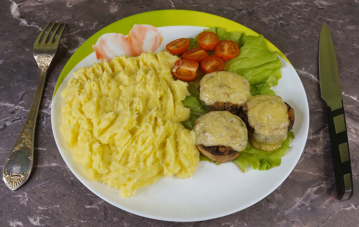 Здравствуйте дорогие читатели, хочу представить вашему вниманию очень интересный и довольно простой рецепт шампиньонов с начинкой из рубленой индейки и сыром сверху. Этот легкий и диетический рецепт подойдет каждому без исключения, а так же под любой повод, будь это праздничный стол или же вечерний одинокий ужин, будь это горячее блюдо с гарниром или же холодная закуска. В общем, это блюдо не оставит равнодушных. Пошаговый рецепт с фото: Ингредиенты: Процесс приготовления: Шаг 1. Подготовим все необходимые ингредиенты указанные выше. Шаг 2. Филе бедра индейки необходимо измельчить в рубленый фарш, я делал это ножом, вы же можете сделать это как вам удобнее, например при помощи блендера или же мясорубки с крупной решеткой. Шаг 3. Луковицу берем средних размеров, так как фарша получается не так много, как раз по количеству грибов. Лук нарезаем как можно мельче. Шаг 4. Отделяем ножки грибов от шляпки. Ножки убираем в сторону, так как они нам еще пригодятся. Так же нужно вычистить всю н