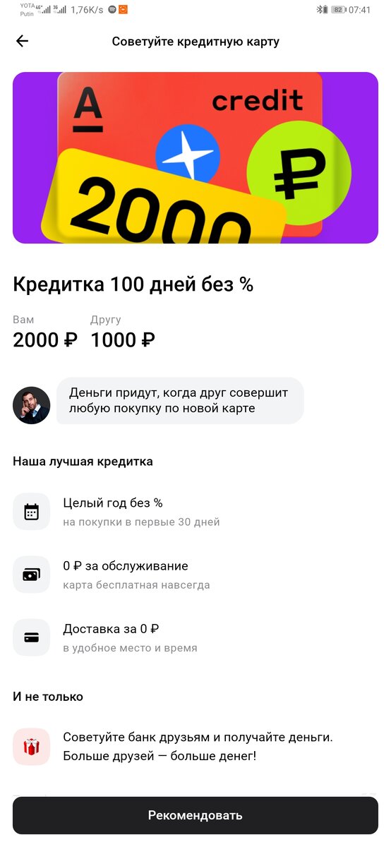 Сегодня "Альфа-Банк" представили новую акцию, в рамках которой он выплачивает деньги за заказ кредитной карты. При этом платить вам ничего не нужно И так, что же требуется от вас Заказываете карту по данной ссылке, после чего курьер привожит ее в удобное для вас место и время После получения карты идем в любой магазин, покупаем с нее продуктов или чего-то еще. Можно обойтись одной пачкой молока, в среднем это 70р Далее с любой другой карты возвращаем 70р на кредитную карту и ждем. В течении 3-4 дней деньги поступают на ваш счет, после чего заходим в приложение и закрываем кредитную карту. А теперь вы можете приглашать людей по своей ссылке, и за каждого человека вы будете получать 2000 рублей!