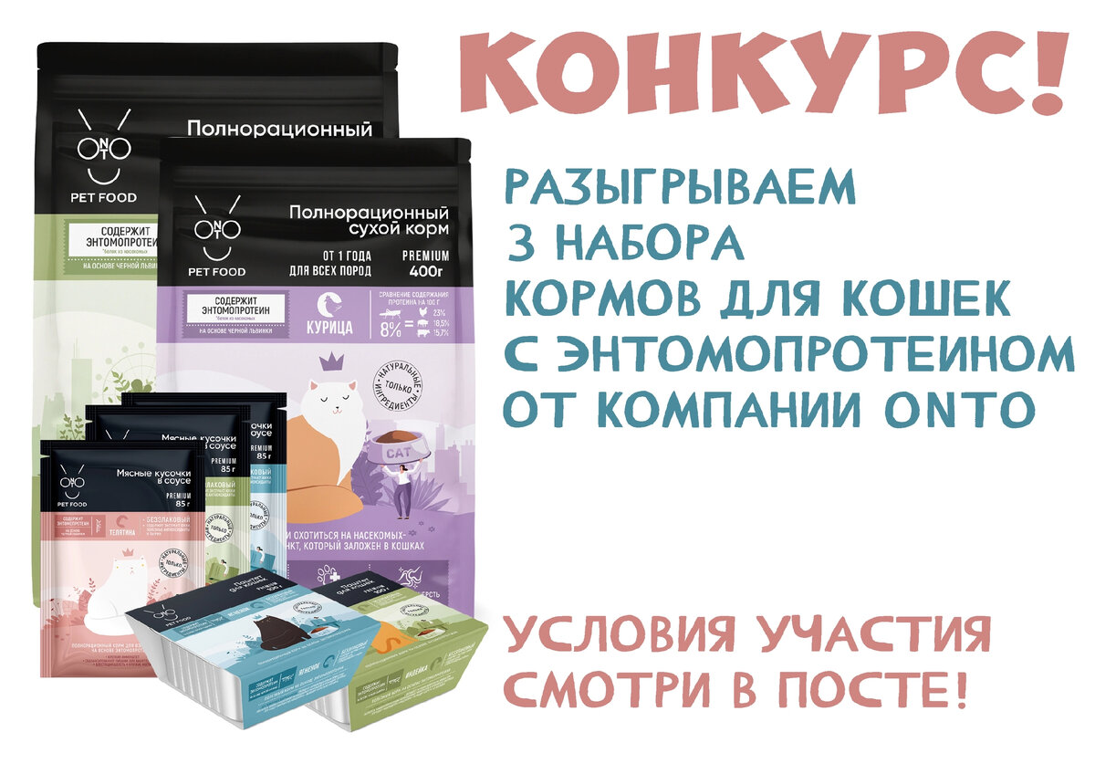 Ребята, любители животных! В последнее время все большую популярность набирает идея, что котики должны кушать не только мяско. Им также очень полезны 🦗. И сейчас даже выпускают корм в котором наравне с мясом содержатся 🦗. Называется это умным словом - энтомопротеин, во как ☝️ На самом деле, между нами мне бы не пришло в голову купить в магазине такой корм, я боюсь 🦗😂Но нас угостили и мои кошки оценили корм 👍 В общем, если вам интересно, вы можете ознакомиться с группой в ВК КакогоЖука?! и поучаствовать в конкурсе ☝️ Розыгрыш 3-х наборов кормов для кошек! "Мы разыграем сразу 3 набора кормов с энтомопротеином для ваших котиков от компании ONTO | Pet Food ! В набор входят: - 2 упаковки по 400 гр. полнорационального сухого корма. - 2 упаковки по 100 гр. паштета. - 3 упаковки по 85 гр. мясных кусочков в соусе. (все корма с добавлением энтомопротеина (белка из насекомых)!) Условия участия очень простые! 1. Быть подписчиком группы КакогоЖука?! / Экзотические животные и насекомые