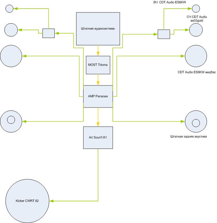 Обсудили схему и вот машина в работе. Вот схемка делаем 2.5 — каналку (или — "полу-поканалку") . В качестве усилителя\процессора — у нас опять AMP Panacea (6-ти канальный процессорный усилитель) , которая отлично справляется с поставленными задачами.