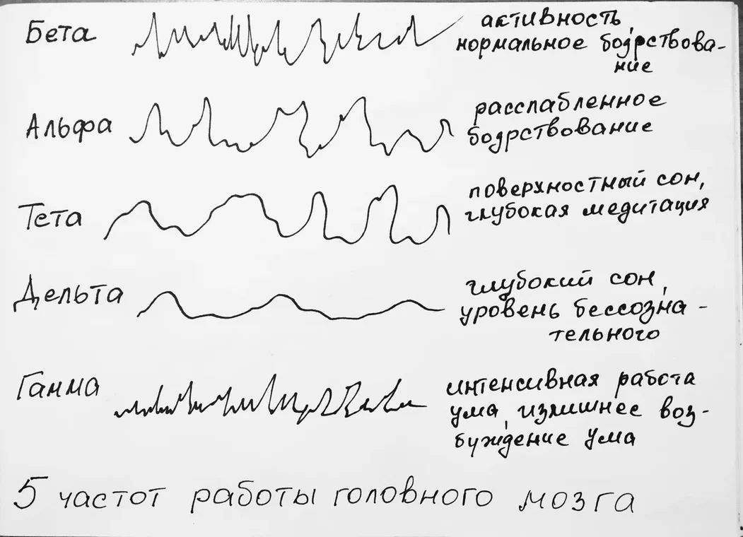 Вы, наверняка. знаете, что мозг человека работает в 5-ти различных ритмах. А вы знали, что рисование определенных сюжетов настраивает человека на соответствующее внутреннее состояние? Ритмы головного мозга разделяются на ритмы активности и релакса. Все ритмы ниже на фото.