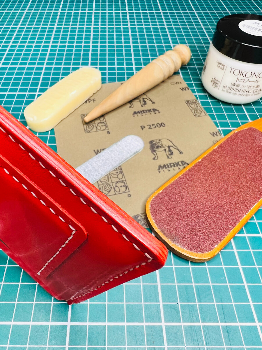 Что такое урез? Как его обработать? Урез — линия среза кожи. Торец. Его можно обработать, загладить. А можно оставить и так. Есть такие изделия, которые «просят» никак не обрабатывать урез. Есть много различных способов, как сделать урез гладким и красивым. Процесс зависит от самой кожи, ваших предпочтений и желаний. В этой статье я покажу, один из моих любимых способов обработки уреза. Для примера у меня кожа козы — четыре слоя. Обрабатывать буду готовый холдер для документов. Первое — выравниваю срез. Он должен быть идеально РОВНЫМ! С помощью каучука очищаю урез от остатков клея. С помощью наждачной бумаги (разной зернистости от Р600 до Р3000) или обычными пилочками для ногтей (они тоже бывают разные по зернистости) выравниваю урез. Движения перпендикулярные или диагональные по отношению к урезу. Таким образом можно убрать кромку без кромкореза и получить урез закругленной формы. На подготовленный урез наношу немного воды. Можно это сделать ватной палочкой, небольшим кусочком губки и