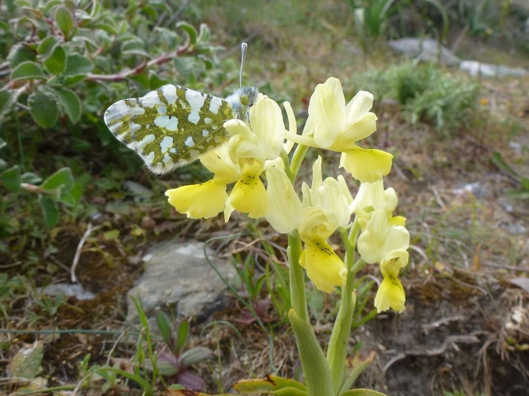Эта красавица в солнечном одеянии не любит соседства с людьми – предпочитает места уединенные, будь то горные долины или даже каменистые склоны (до 1700 м над уровнем моря). Так что встреча с ней – настоящая «нечаянная радость» для туристов-пешеходов на острове Крит. Зовут эту беглянку от людей Orchis pauciflora. Orchis (от древнегреческого ὄρχις) означает «яички» – из-за парных клубней, напоминающих соответствующий анатомический орган. Pauciflora означает «мало-/редкоцветковый». Русское название более прозаично – «ятрышник». По Далю, оно происходит от «ядришник» и «ядро», что вполне логично, если вспомнить про Orchis. Желтокудрая красавица невысока – до 30 см, но осанка – царственная! Ланцевидные листья обнимают прямой стебель, увенчанный соцветием из 2-8 крупных цветков. Лепестки обычно лимонного цвета, за исключением центрального – темно-желтого, в крапинах. Задний лепесток и вовсе уникум – в виде шпоры, изогнутой на конце вверх. Помните головной убор феи (или средневековой дамы) в