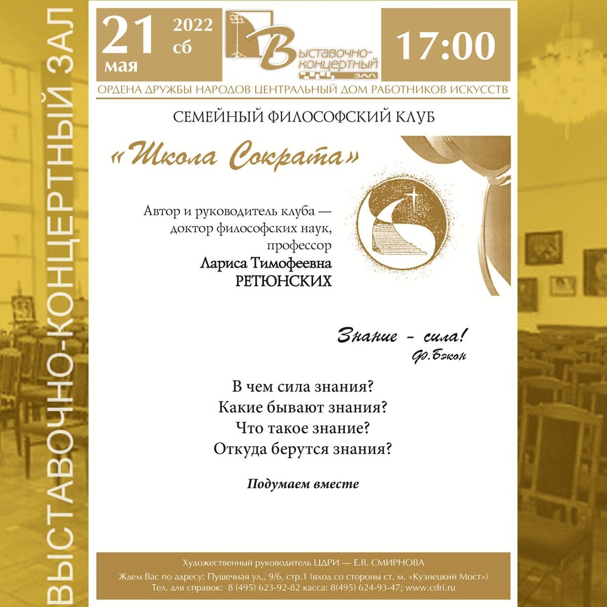Выставочно-концертный зал Центрального Дома работников искусств Билеты на сайте: https://cdri.ru/afisha/maj-2022/shkola-sokrata_21-maya.html