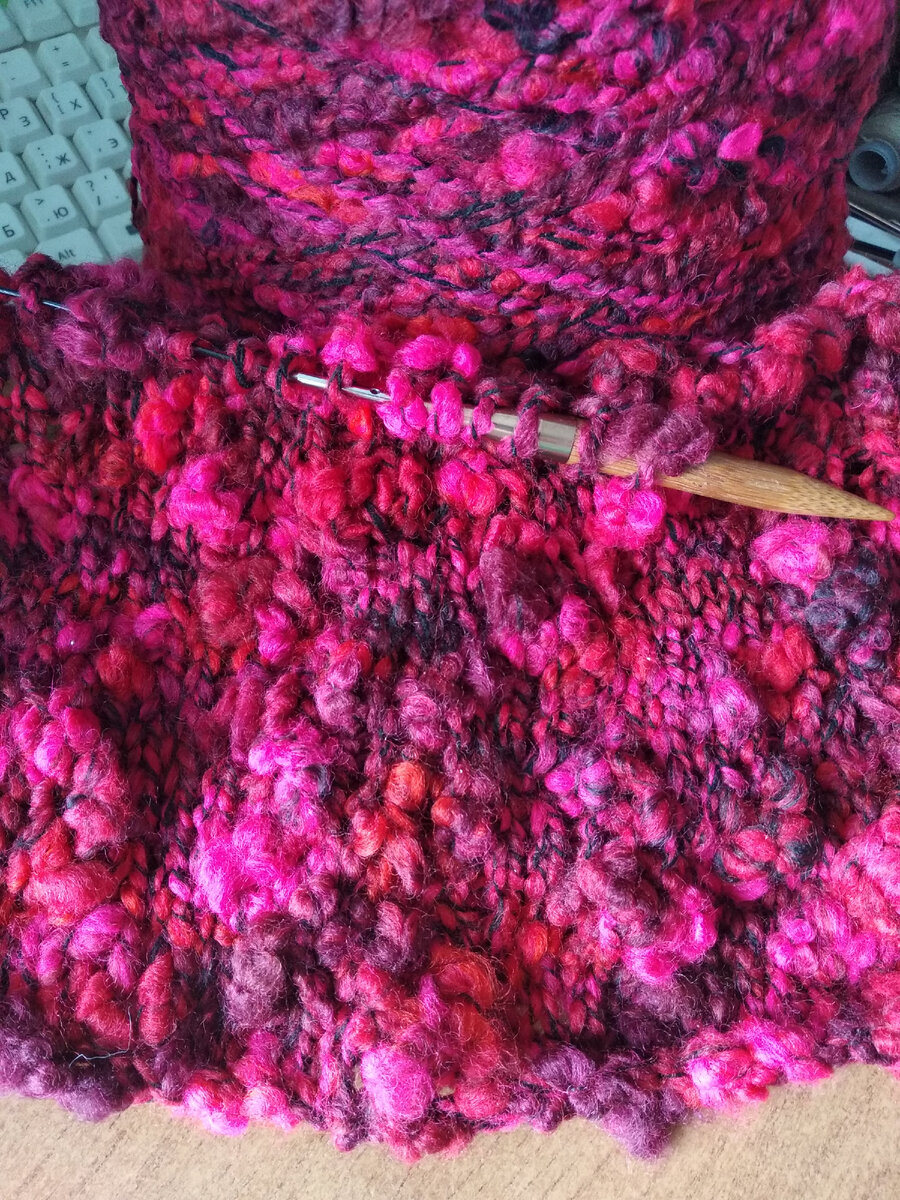 Давно стоит у меня бобинища этой красивой пряжи Di.Ve. ALLEGRO TRICOLORE 75м/100г, 55% шерсть 45% акрил, цвет бордо-рубин-розовый, и вот, наконец, я решила связать из неё жилет. Пряжа очень красивая и мне снова и снова кажется, что это меринос премиум-класса, пока я не взгляну на состав. Очень красивые цвета. На фото они получились более светлыми, но в реальности ещё лучше: более насыщенные, глубокие... Вяжу спицами №10. Ниточка неоднородная с эффектом фламе - с участками нити, разными по толщине. А так как пряжа толстая, и эффект получается ну очень необычный. Здесь я впервые для себя применила прием, когда лицевые ряды вяжутся спицей, на размер больше, чем изнаночные. Это преимущество спиц со сменной леской. Круговыми несъемными спицами тоже можно вязать этим способом, но нужно будет взять две пары спиц с разным размером. Жилет я вяжу очень просто - спинку и небольшие полочки одновременно до пройм, затем спинку и проймы отдельно. Соединю полочки на плечах и буду вязать одновреме