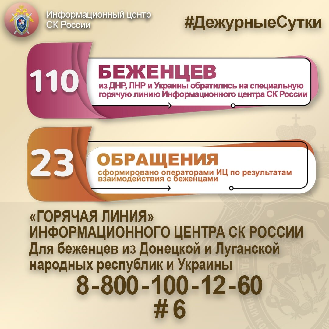 110 - беженцев из ДНР, ЛНР и Украины обратились на специальную горячую линию Информационного центра СК России 23 - обращения сформировано операторами по результатам взаимодействия с беженцами 20 - личных приемов беженцев организовано Информационным центром в территориальных следственных органах 87 - разъяснений и консультаций даны беженцам операторами Информационного центра. Напоминаем, что мы с вами на круглосуточной связи. Обратиться к нам вы можете, написав: 🔸«ВКонтакте» - Приемная Председателя СК России vk.com/priemnaya_bastrikina и группа Информационного центра vk.com/infocentrskrf 🔸«Телеграм» — канал t.me/infocentrskrf 🔸«Одноклассники» — группа ok.ru/group/61254572769397 или позвонив: 🔸8-800-100-12-60 - многоканальная телефонная линия: - «Ребенок в опасности» - «Телефон доверия» - «Остановим коррупцию» - «Давление на бизнес» - «Справочная информация» - «Для беженцев из Донецкой и Луганской народных республик и Украины» #СледственныйКомитет #СКРоссии #СКР #ИЦСКР #СК