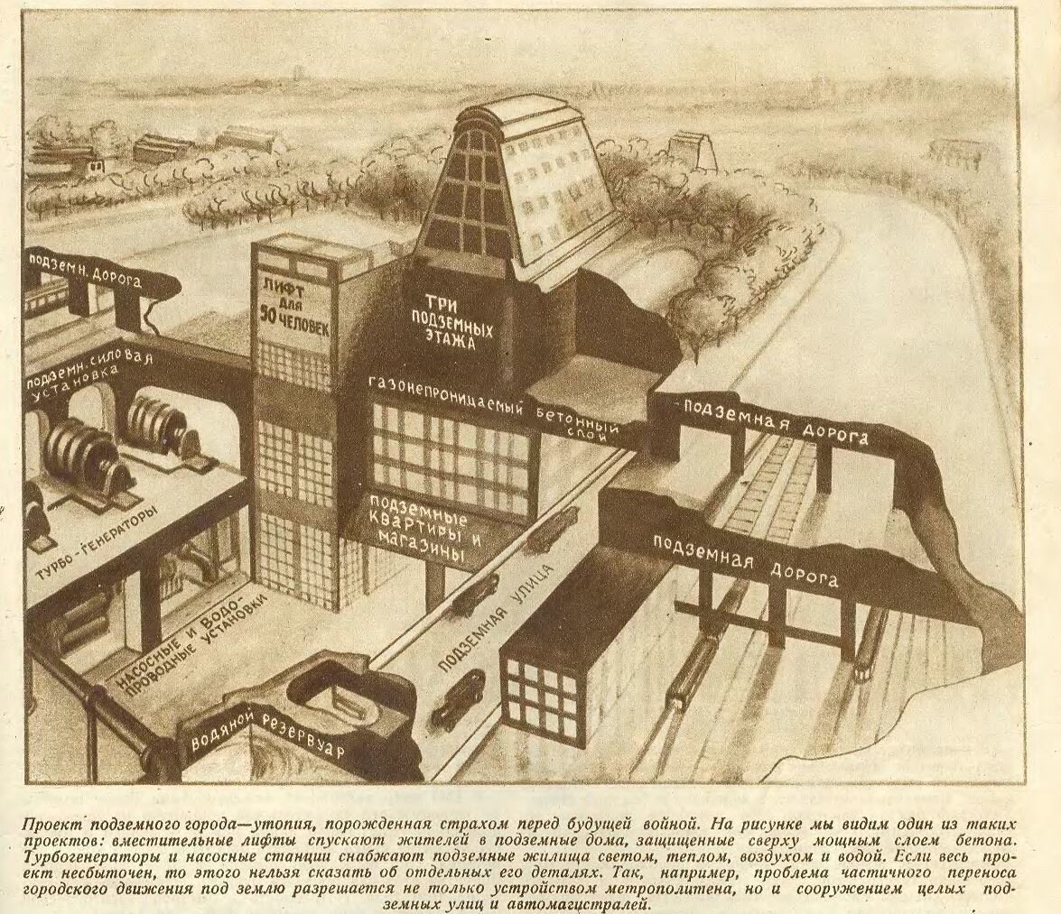 Архитектура - вечный поиск чего-то нового, интересного. Хотя Советский союз и ассоциируется у нас в первую очередь с хрущевками, советским урбанистам, футурологам и архитекторам необходимо отдать должное. Порой они предлагали действительно колоссальные идеи, которые к сожалению, не нашли поддержку у руководства. Подземные дома - мечта урбанистов 30-х После Октябрьской революции и гражданской войны тема обороны городов была очень популярна. Ее подхватили и развили урбанисты. Например, отдельными архитекторами было внесено такое предложение: строить города под землей, оставляя сверху лишь необходимые средства противовоздушной обороны. Журнал «Техника - молодежи» за январь 1937 года содержал проект такого урбанистического города, в который можно попасть только на больших лифтах. Сверху конструкция защищалась толстенным бетонным пластом. Подача необходимых тепла, воздуха, воды и света происходит при помощи насосов и генераторов, присоединенных к паровым или газовым турбинам. Кроме того, в