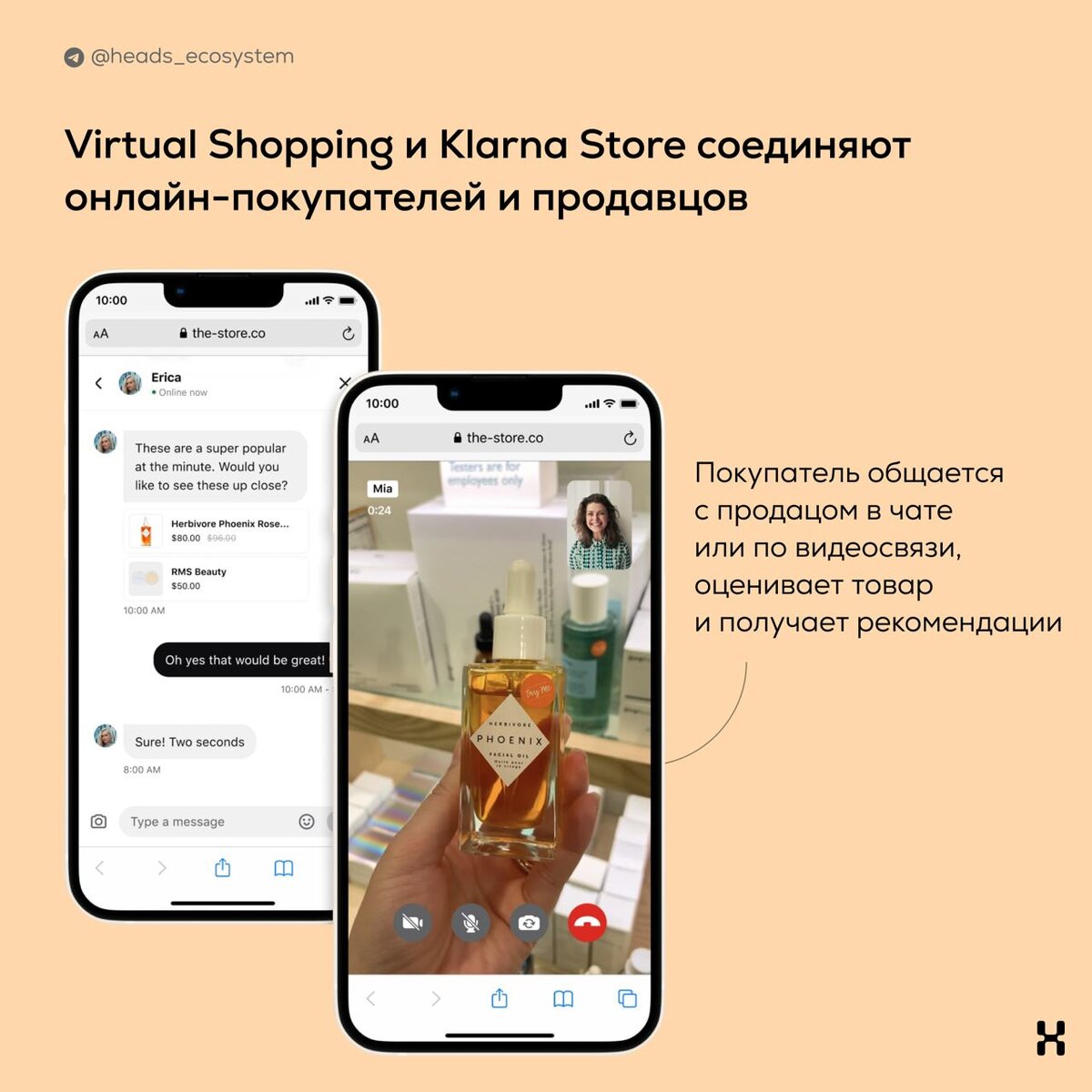 Klarna запустила сервисы Virtual Shopping и Klarna Store, чтобы улучшить опыт онлайн-покупок 😯Кто: Экосистема Klarna 💪🏼Что сделала: Представила сервисы Virtual Shopping и Klarna Store, которые связывают онлайн-покупателя и продавца в розничном магазине с помощью видеоконсультации и чата. ⚙️Как работает: Virtual Shopping — сервис для покупателей, который поможет познакомиться с товаром, не ограничиваясь стандартным наполнением карточки. Пользователь переходит в интегрированный с Klarna магазин, нажимает на кнопку Shop Virtually в карточке товара и связывается с продавцом в чате или в формате видеоконсультации. Продавец проведет презентацию товара, ответит на вопросы и поможет с выбором. Klarna Store — приложение для магазинов, в котором продавцы получают заявки на консультации и общаются пользователями. Сервис сохраняет контакты покупателей, которые обратились за советом. Магазины анализируют боли пользователей и отправляют персонализированные предложения, чтобы превратить разовых