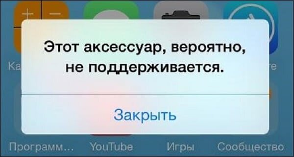 Появление рассматриваемого в статье сообщения обычно сигнализирует, что-то пошло не так при подключении аксессуара к порту зарядки (Lightning iPhone). Вариативность факторов, вызывающих данную проблему, обычно такова: