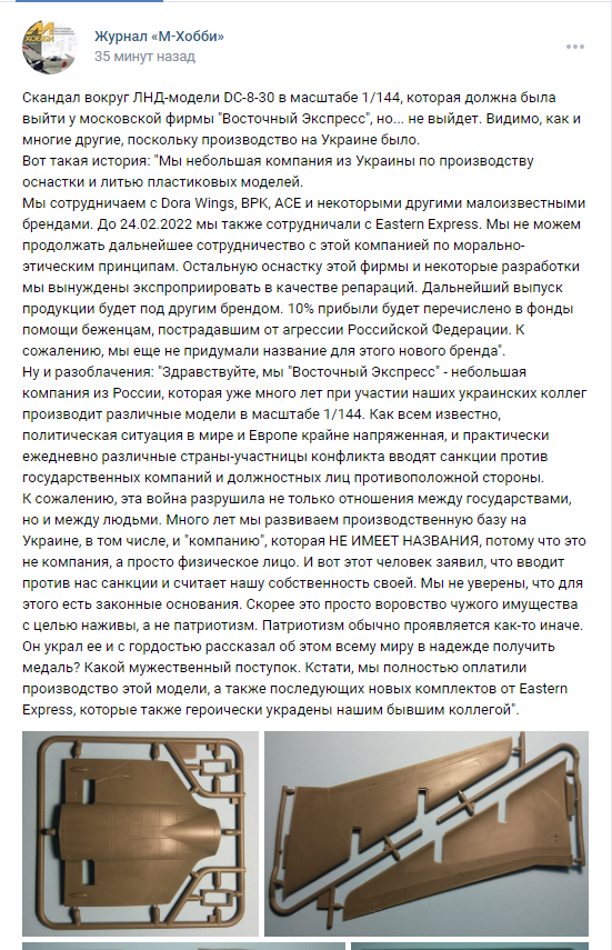 Приветствую всех. Хотел начать публикации о моделизме совсем с другого, но на мой взгляд случай откровенно вопиющий. Сегодня в группе журнал "М-Хобби" в ВК появился такой пост Скандал вокруг ЛНД-модели DC-8-30 в масштабе 1/144, которая должна была выйти у московской фирмы "Восточный Экспресс", но... не выйдет. Видимо, как и многие другие, поскольку производство на Украине было.
