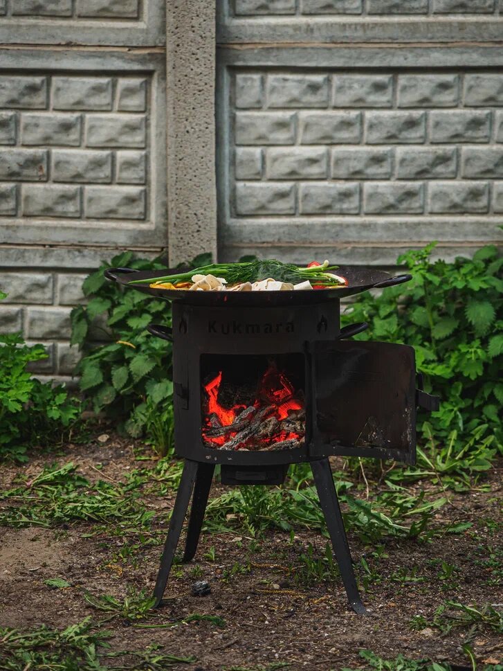 В уличных условиях готовить и на стальном, и на чугунном садже можно а открытом огне (углях или газовой горелке) на импровизированной подставке из камней или огнеупорных кирпичей, на магнале, либо использовать фирменные треноги от TM Kukmara подходящего диаметра. Особенно удобно садж использовать с кукморской походной печью и учагами для казанов.