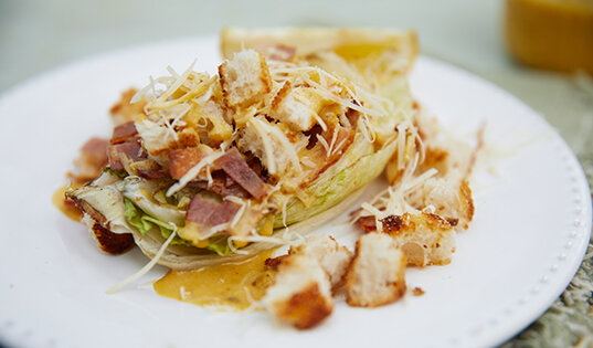 Новый формат подачи, новый способ приготовления, классический соус и улётный вкус с ароматом дымка - это все о нём, салате Цезарь на гриле. Главная фишка этого блюда в том, что салат Романо (можно взять Айсберг), ломтики хлеба, бекон (или грудинка) обжариваются на гриле, а потом собираются башенкой на тарелке. Неизменным остается лишь классическая заправка, приготовленная самостоятельно - кстати, она у нас проверенная и очень вкусная😋 Вам понадобится: Салат Романо или Айсберг 1 шт.