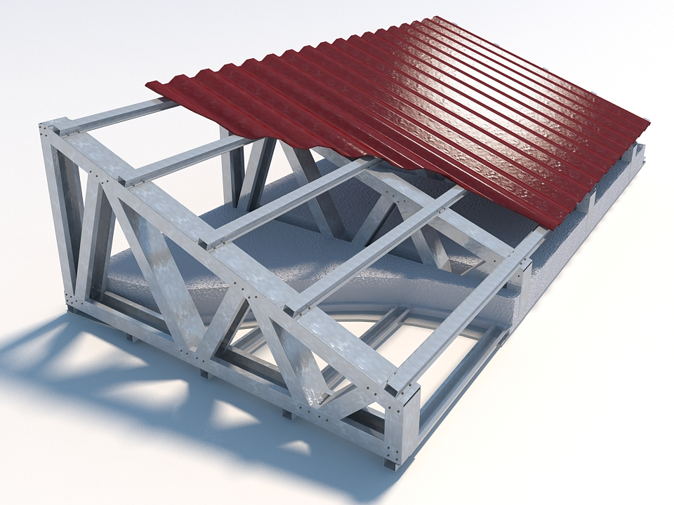 В строениях на основе из ЛСТК кровля опирается на несущие стены дома - вертикальные стойки из металла, обшитые OSB-плитами до самого верхнего бруса стенового покрытия. К монтажу кровли приступают после сборки каркаса и установки стен, а после сооружения крыши проводят декоративную отделку стен и выполняют подшивку фронтонов и карнизных свесов.