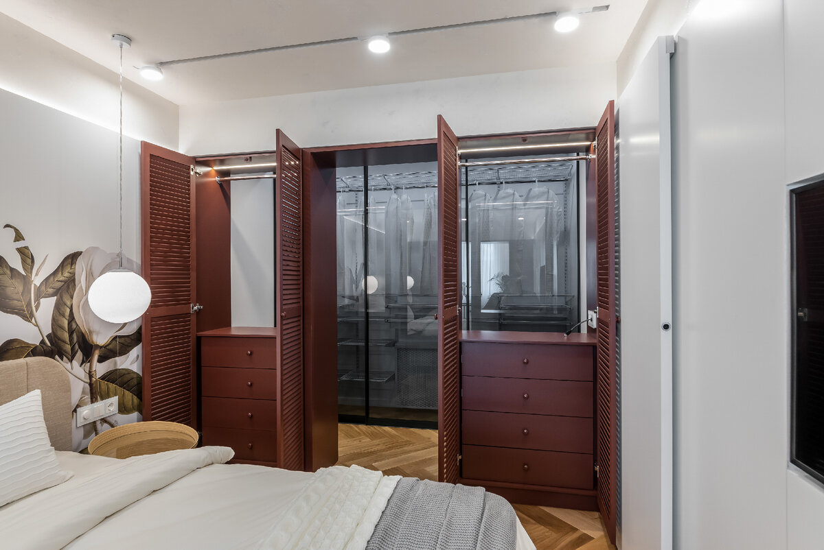 Обустроить гардеробную с помощью системы Larvij можно в любой комнате квартиры или дома, но одним из наиболее удобных вариантов является спальня. Это место, как правило, используется для хранения одежды, здесь же удобно переодеваться. Выберите наиболее подходящий способ организации гардеробной в спальне! Гардеробная за стеклянной перегородкой Зону хранения одежды можно отделить с помощью стеклянной перегородки. Она выглядит очень стильно, а также защищает вещи от пыли. Стеклянная перегородка особенно уместна в небольшой спальне. Если обычные двери-купе лишают пространство «воздуха», то стеклянные двери наполняют комнату объёмом и светом. Открытое хранение Если к решению открытого хранения в гостиной многие относятся со скепсисом, то в спальне сетчатые полки и корзины с вещами смотрятся абсолютно органично. Для установки системы сгодится любой свободный участок стены или угол. Набор элементов зависит от особенностей гардероба пользователя: длинная одежда, юбки, брюки, пиджаки и т.д. Гар