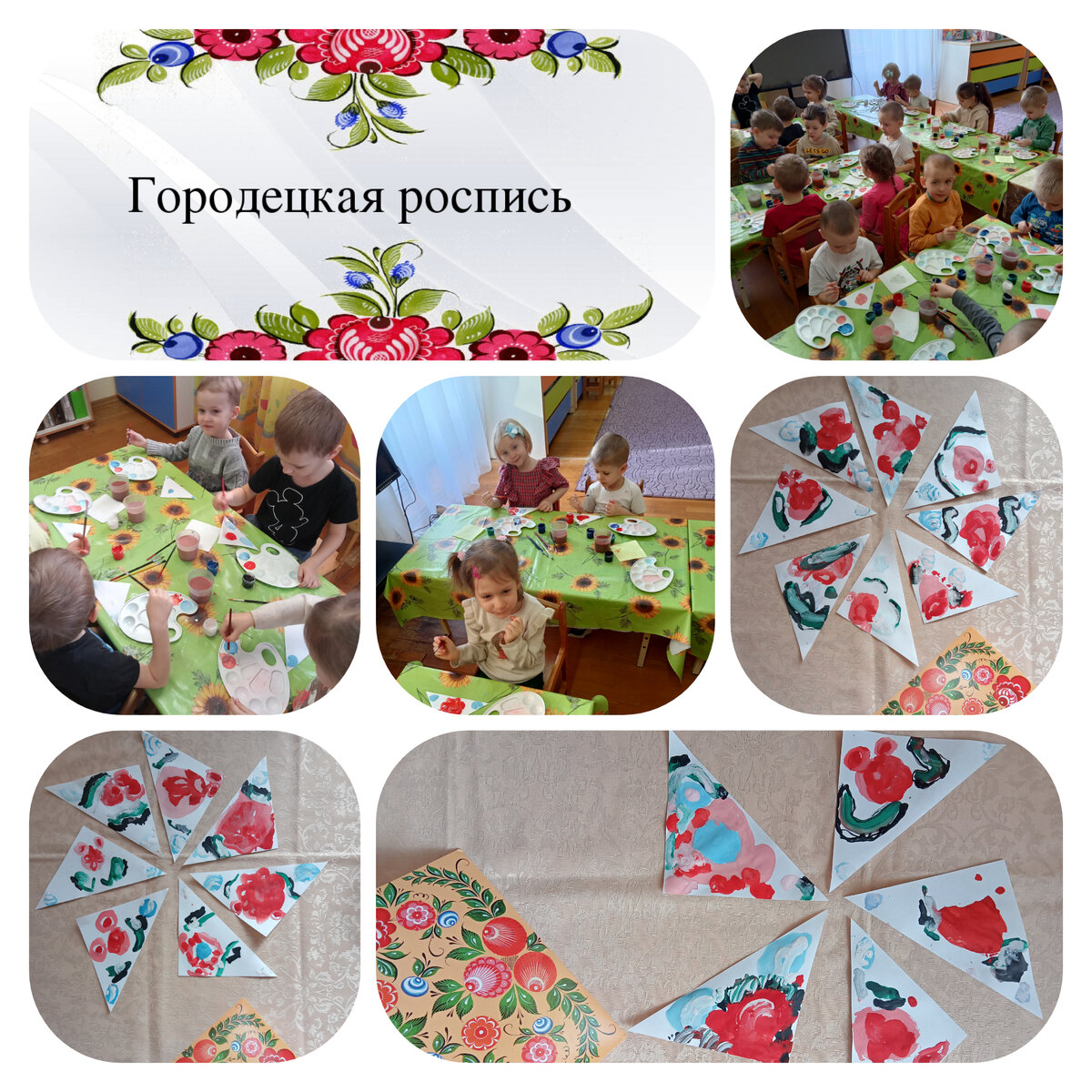 Сегодня воспитанники средней группы МБДОУ №132 отправились в город Мастеров расположенный на берегу реки Волги. А называется этот город – Городец. Ребята рассмотрим изделия и узоры городецкой росписи, оценили работу городецких мастеров, а потом превратились в их помощников. Дети смешивали краски на палитре, стараясь добиться нужного цвета и старательно выводили узоры на платочках.